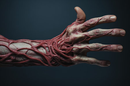 Explore a striking illustration showcasing a human hand and arm, featuring the intricate vascular system. Ideal for educational purposes in medical fields.