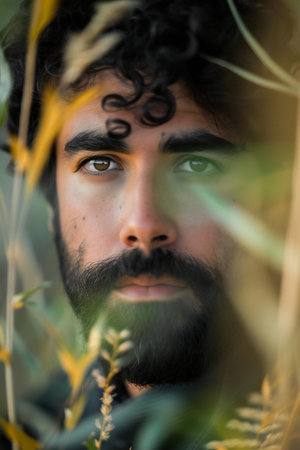 Portrait of a young man with long black curly hair and beard in the grass.