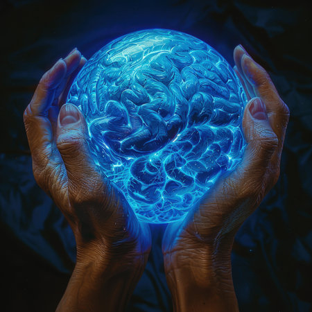 A gentle hand cradles a clear glass orb revealing an intricate miniature brain, representing mental acuity and insight, set against a calming pastel blue backdrop.
