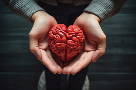 A detailed anatomical heart is cradled gently in gloved hands, highlighting its complex structure and veins under soft lighting.