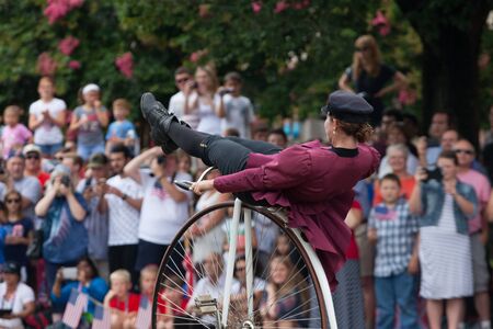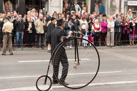 MUNICH, GERMANY - 19 October 2015: Tent owners and Breweries parade at the beginning of Oktoberfest - Riding on penny farthing