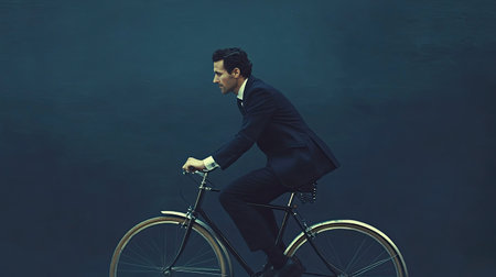 A surreal depiction of a man in a formal suit riding a vintage bicycle underwater. The image captures a unique blend of elegance and creativity, inviting viewers to explore themes of tranquility and freedom in unexpected settings.