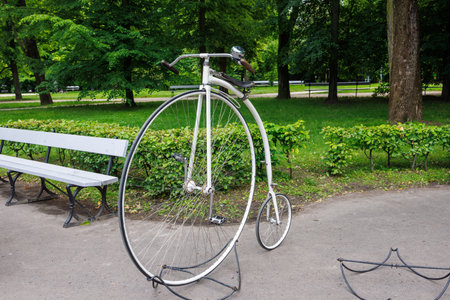 White vintage bicycle with a large front wheel and a small rear wheel in a city park. Penny Farthing in the park. High quality photo