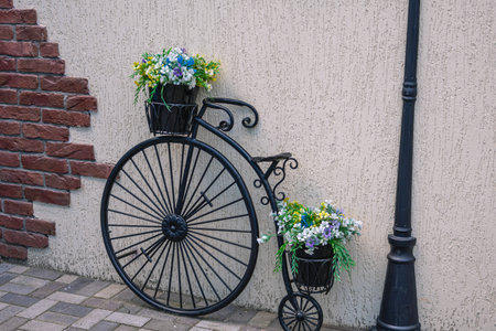 A retro bike decorated with flowers. Decorations on the streets of the city. An antique bicycle by the wall.