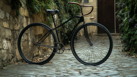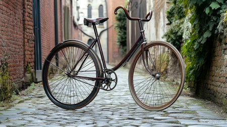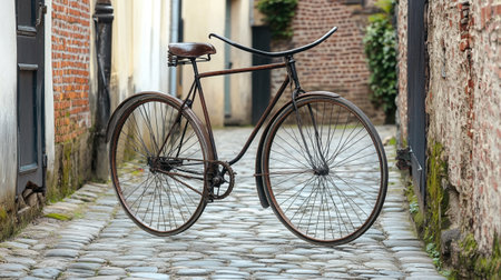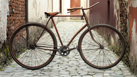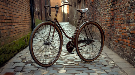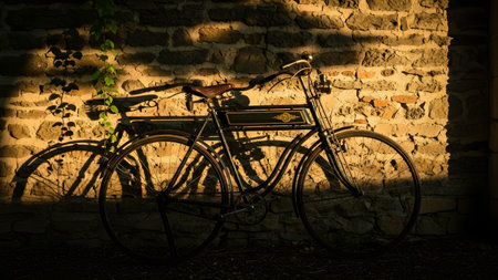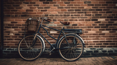 A classic bicycle rests against a textured brick wall in an outdoor setting, likely a street or public space. The image displays a vintage aesthetic with metal frame and leather seat. Soft sunlight bathes the scene, highlighting the details. Suitable for commercial projects or editorial use.