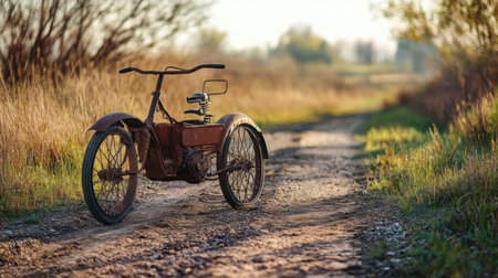 Vintage two-wheeler on a dirt road, tires cracked, metal frame dulled by time