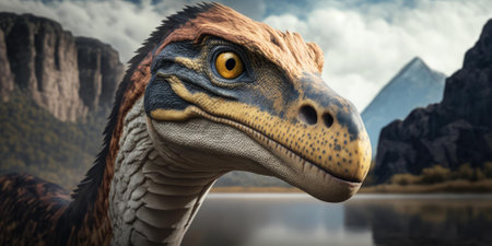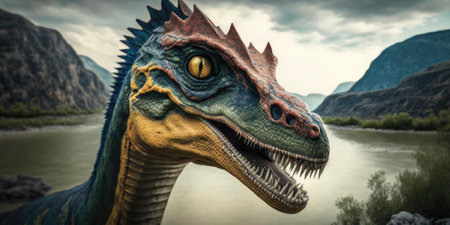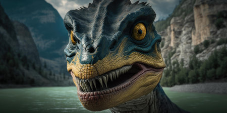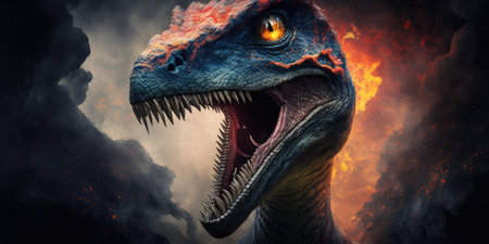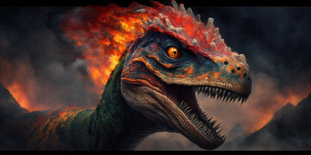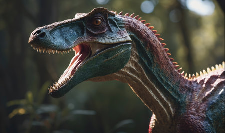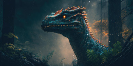 AI Generated. a fierce dinosaur emerges from the shadows showcasing its powerful jaws and intense gaze