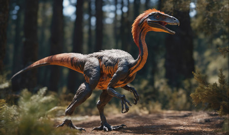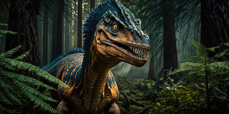Velociraptor in a lush prehistoric forest with detailed features, ferns, and vegetation, ideal for nature, wildlife, and educational use.
