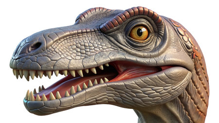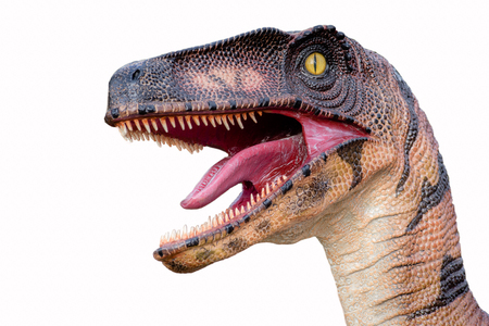 Portrait of a dinosaur, head only mouth open showing tongue against a white background