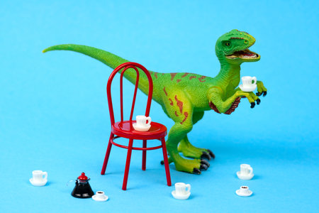 Children's toy ancient predator dinosaur on a wooden table in a room flooded with sunlight. Toy tyrannosaur from plastic. Ancient predatory reptile from the Mesozoic era Jurassic