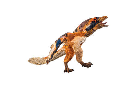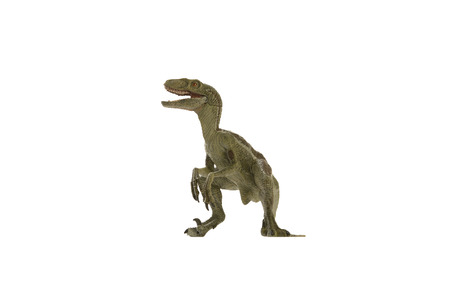 A worn out plastic dinosaur isolated on a white background. allosaurus