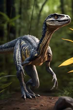 Velociraptor pack stealthily advances through fern filled underbrush, poised for the hunt