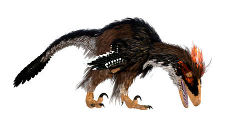 Deinonychus raptor dinosaur feeding. 3D illustration isolated on white background.