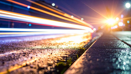Abstract long exposure light trails from headlights stretching over wet asphalt at night.