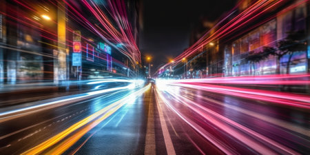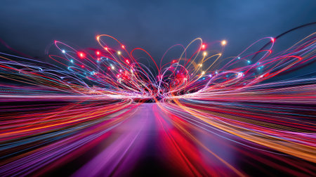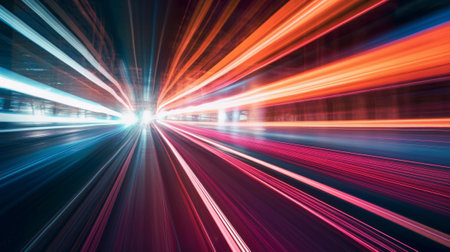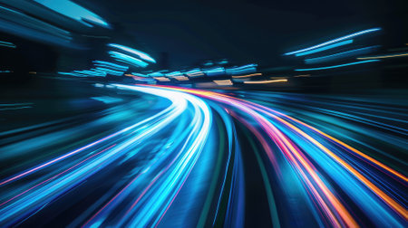 Vibrant light trails create an abstract representation of speed and motion at night, showcasing the dynamic energy of urban environments in a captivating visual display.