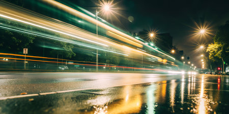 Light showing speeding car light trails on a wet road at night. High resolution image suitable for...