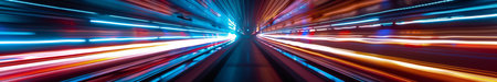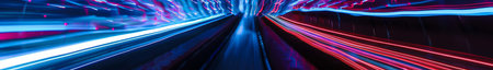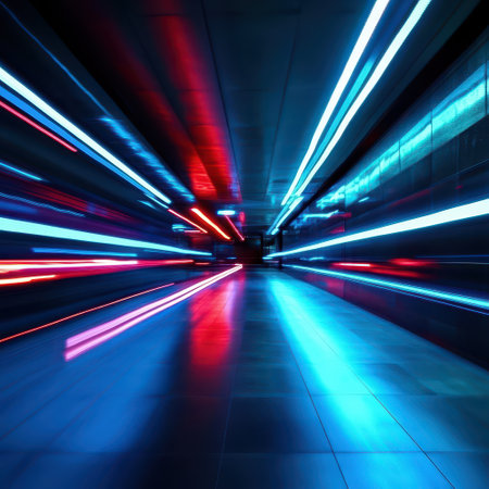 Speeding through a vibrant urban tunnel at night emphasizes movement and light dynamics