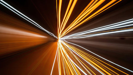 This abstract image showcases dynamic light trails that convey a sense of speed and motion against a dark backdrop, making it ideal for technology and energy projects.