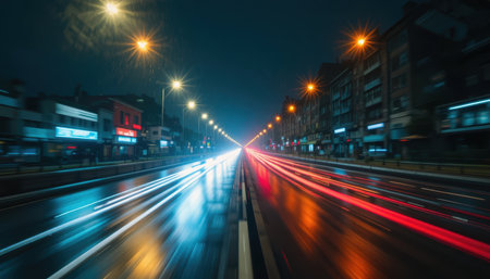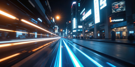 Experience the exhilarating energy of a vibrant city at night with this dynamic image showcasing blurred lights and a futuristic skyline.