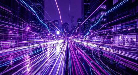 Dynamic light trails create a vibrant and energetic display in a city nightscape with abstract colors and motion blur