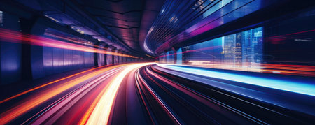A mesmerizing abstract representation of a subway tunnel, showcasing vibrant colors and dynamic lines that evoke a sense of speed and movement.