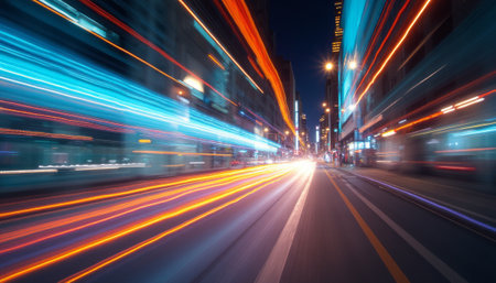 A vibrant city street is captured in a stunning long exposure, showcasing streaks of colorful lights that create a sense of speed and energy. The image evokes the pulse of urban life, with bright blues and warm oranges blending together to illustrate the excitement of a bustling metropolis at night.