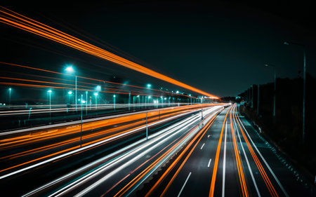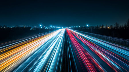 Nighttime highway lights create dynamic streaks of color in a long exposure shot, showcasing fast-moving vehicles along the road
