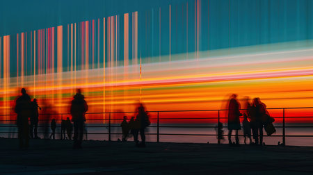 Silhouetted Figures at Sunset Over a Colorful Striped Horizon. background with a sunny gradient color