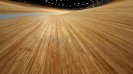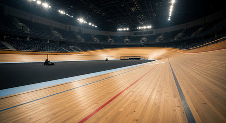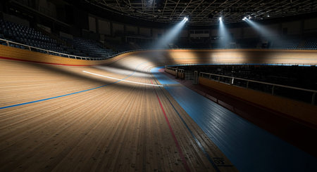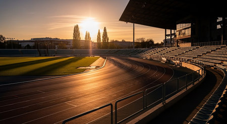 A stunning view of an empty modern stadium, capturing the essence of architectural beauty, dramatic lighting, and vibrant track lines, perfect for sports imagery.