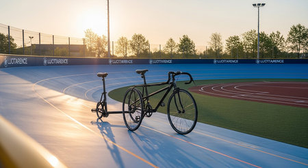 Empty velodrome track bathed in golden sunrise light with stadium seating visible in the background.