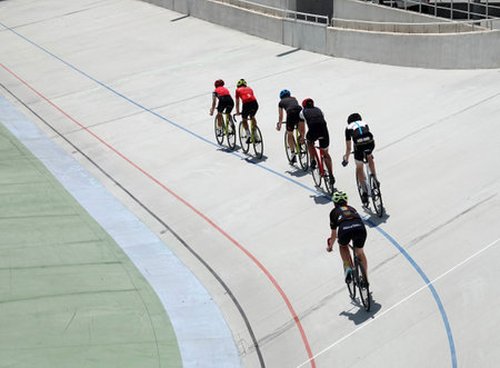 Three cyclists compete on a cycle track in a circle in Kyiv, Ukraine