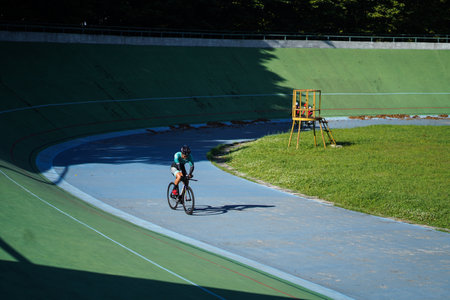 Kiev, Ukraine June 14, 2021: Sports bike track with riding cyclists