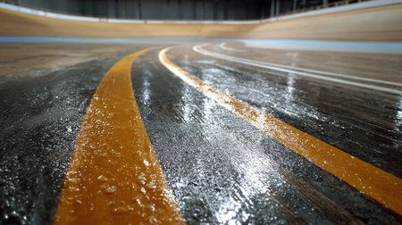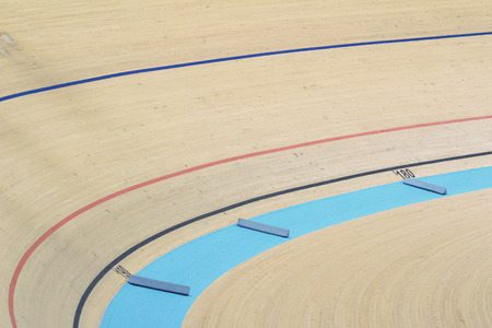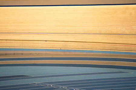 Tracks of an indoor track cycling velodrome with wooden course race-track and blue floor