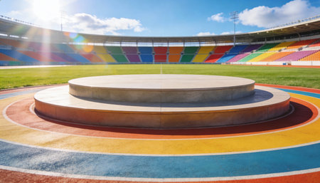 A colorful sports stadium with a central circular platform, surrounded by a multi-colored running track and empty seating areas.