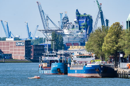 Aerial view of the Elbe River and ships in the city of Hamburg during sunset. Geramania in the summer