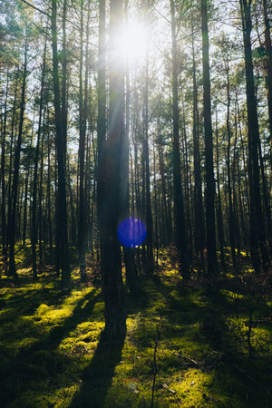 Beautiful pine and fir forest with thick layer of green moss covering the forest floor. Scenic view Sunlight shining through the branches land background. Magical Deep foggy Misty Old Forest Sun Rays and shadows