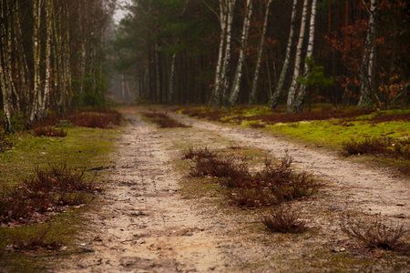 Sandy path through the heaths in the Veluwe National Park during sunset in The Netherlands