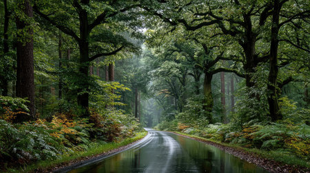 A forest path with a road in the middle. The road is wet and muddy. The trees are tall and the sky is cloudy