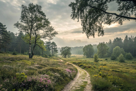 Mystical mood with fog at sunrise in the heath. The heath blooms in strong purple, in between pine trees and golden weed, the sky is dipped in pastel
