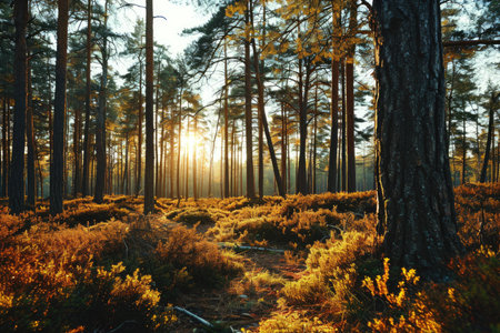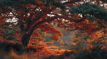 The Scots pine at sunset, Golden red sunset light filters through the leaves, still atmosphere, warm orange glow blending with natural green tones.