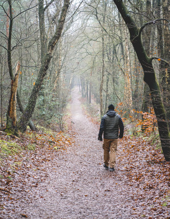 Guy in a red jacket walked on the path, Noorderheide, Elspeet, The Netherlands.