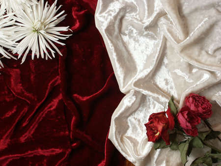 red and white velvet wrinkles background with desiccated red roses and white chrysanthemum