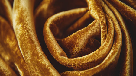 Close-up view of plush gold velvet fabric showcasing elegant curled patterns, perfect for stylish design projects, home decor, and fashion applications.