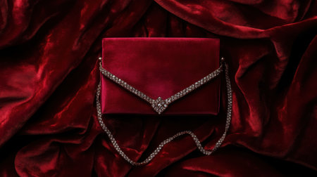 This image showcases an elegant red velvet handbag adorned with sparkling detailing, set against a rich, luxurious red fabric backdrop, perfect for fashion lovers.