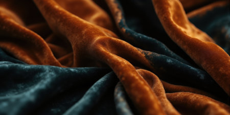 Burnt Orange and Deep Teal Velvet Waves A rich, luxurious close-up of soft velvet fabric forming gentle waves in deep