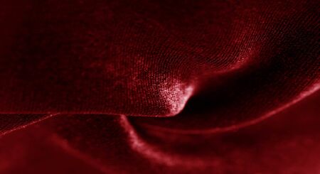 Advertising close-up shot of texture of dark red tone perfect natural velvet fabric chaotically crumpled. High quality photo