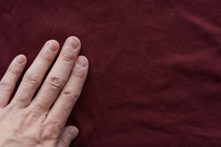 man hand touching red wine color cotton fabric