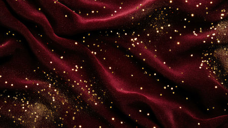 Luxurious deep red velvet background with sparkling gold confetti and a blank area for copy
