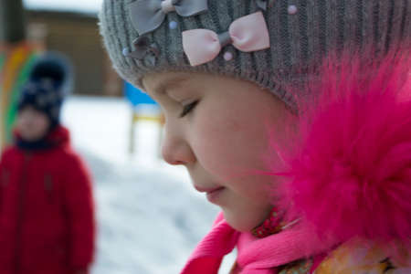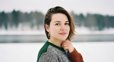 Portrait of a beautiful young girl in a knitted sweater on a background of a frozen lake