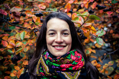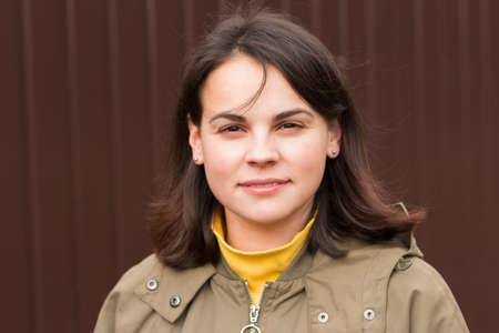 Beautiful cute smiling girl in a casual jacket and dark hair stands on an autumn background